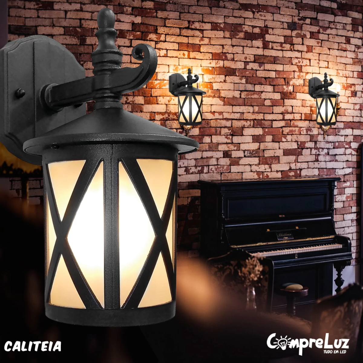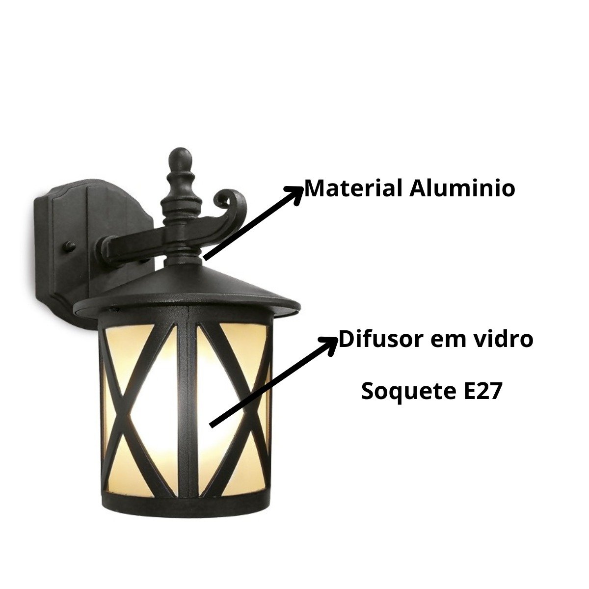 A arandela colonial externa tem um estilo clássico europeu, feita em material de alumínio e vidro jateado. Seu soquete é E27 podendo utilizar a lâmpada com o mesmo padrão de soquete.