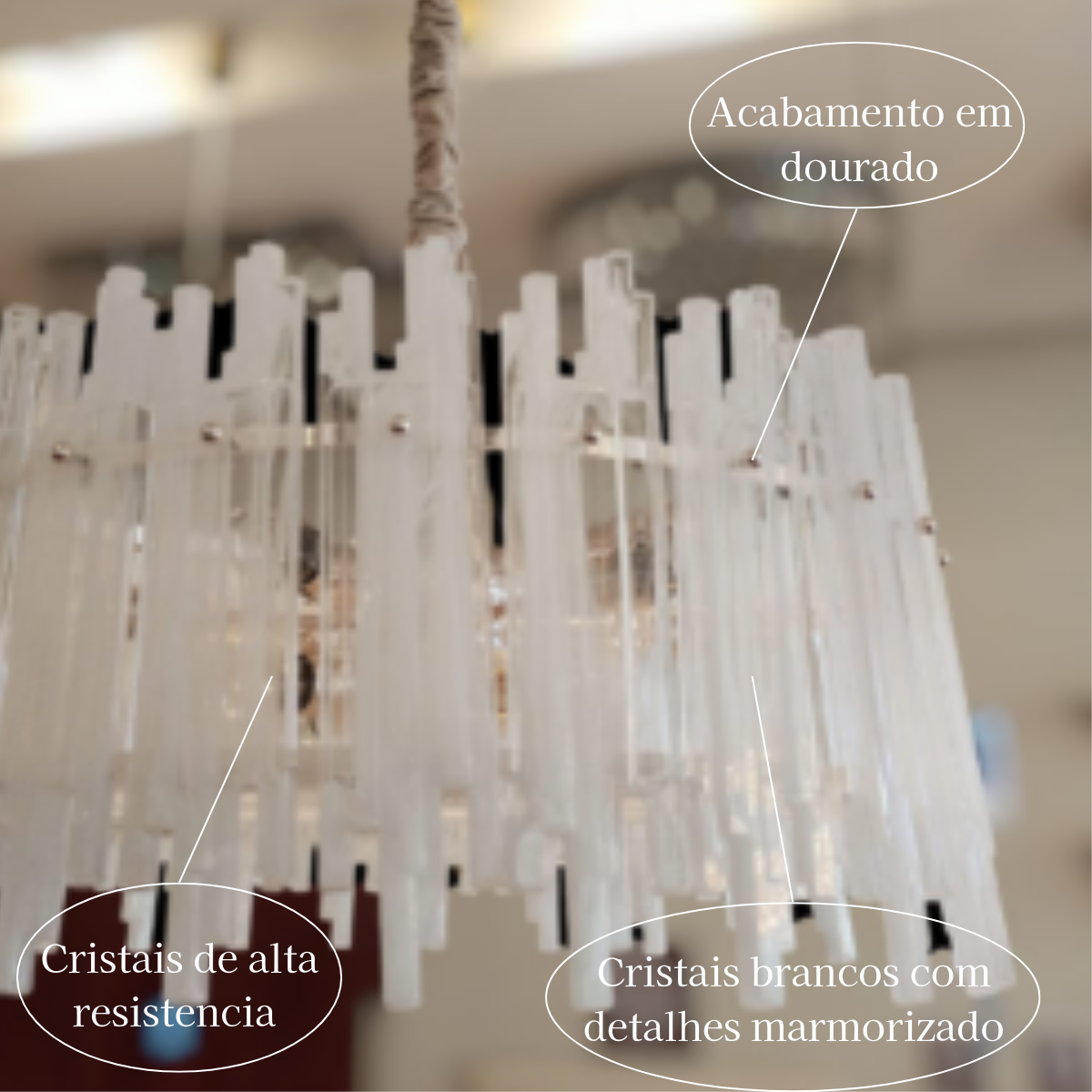 - Design Exclusivo: O marmorizado sutil nos cristais proporciona um efeito de iluminação diferenciado, criando uma atmosfera acolhedora e luxuosa;