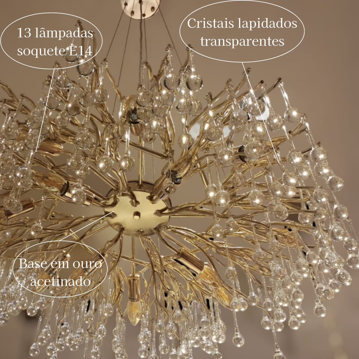 - Material: Estrutura em metal com acabamento dourado e cristais lapidados de alta qualidade.