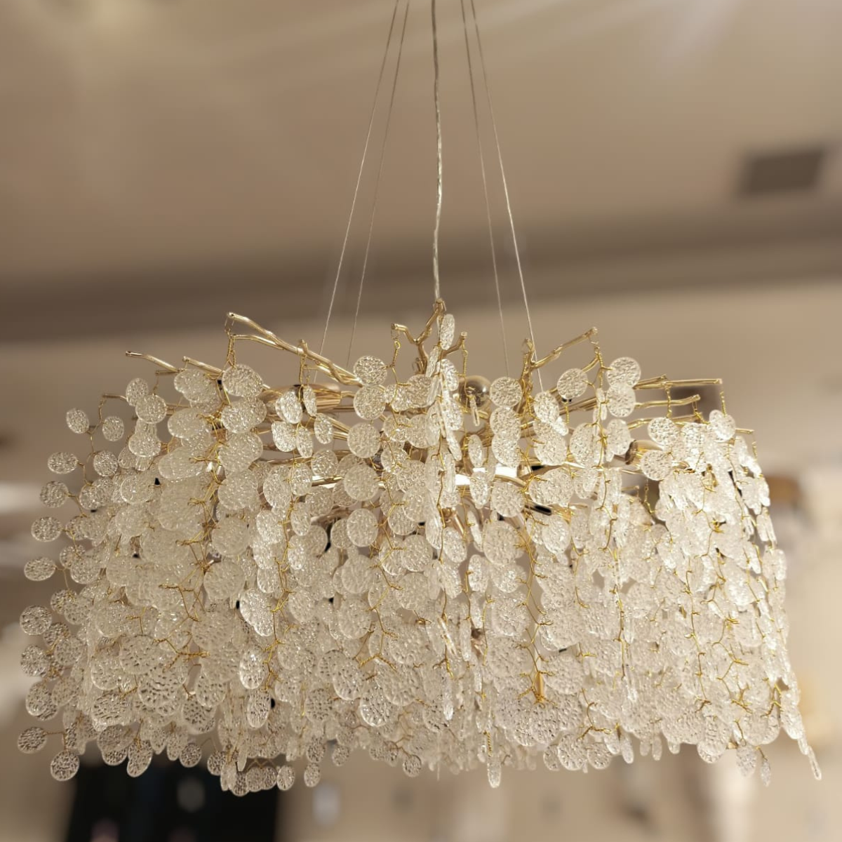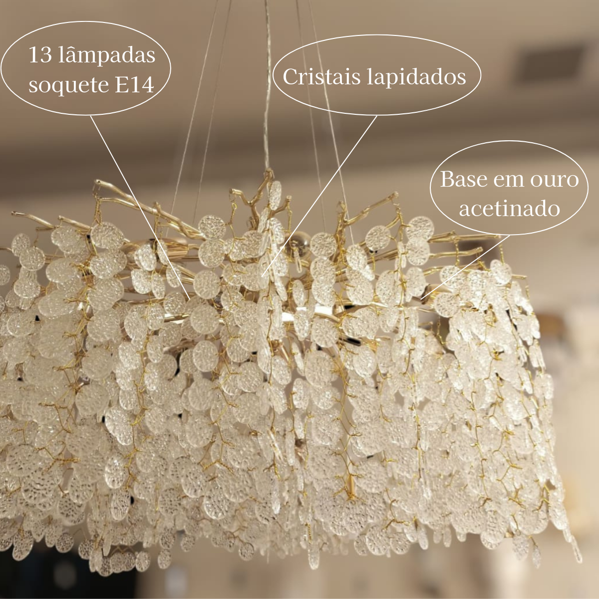 ✨ Cristais Lapidados: Placas de cristal de alta qualidade que criam reflexos radiantes, proporcionando uma iluminação sofisticada e envolvente. ✨ Acabamento Dourado: O tom gold da estrutura complementa a beleza dos cristais, conferindo um ar nobre e elegante ao ambiente. ✨ Iluminação Eficiente: Com 13 lâmpadas E14, oferece uma iluminação difusa e suave, ideal para ambientes amplos. ✨ Ambientes Ideais: Salas de estar, salas de jantar, halls de entrada e outros espaços de grande impacto.