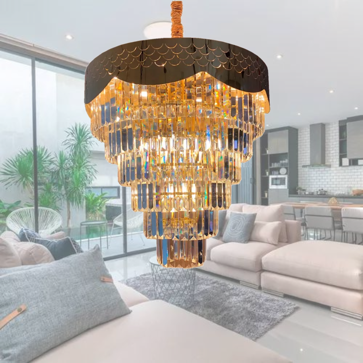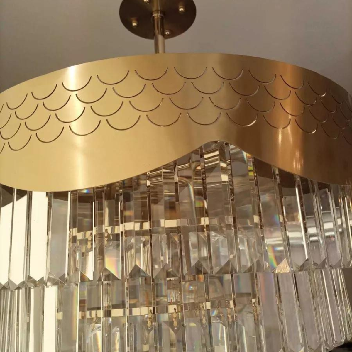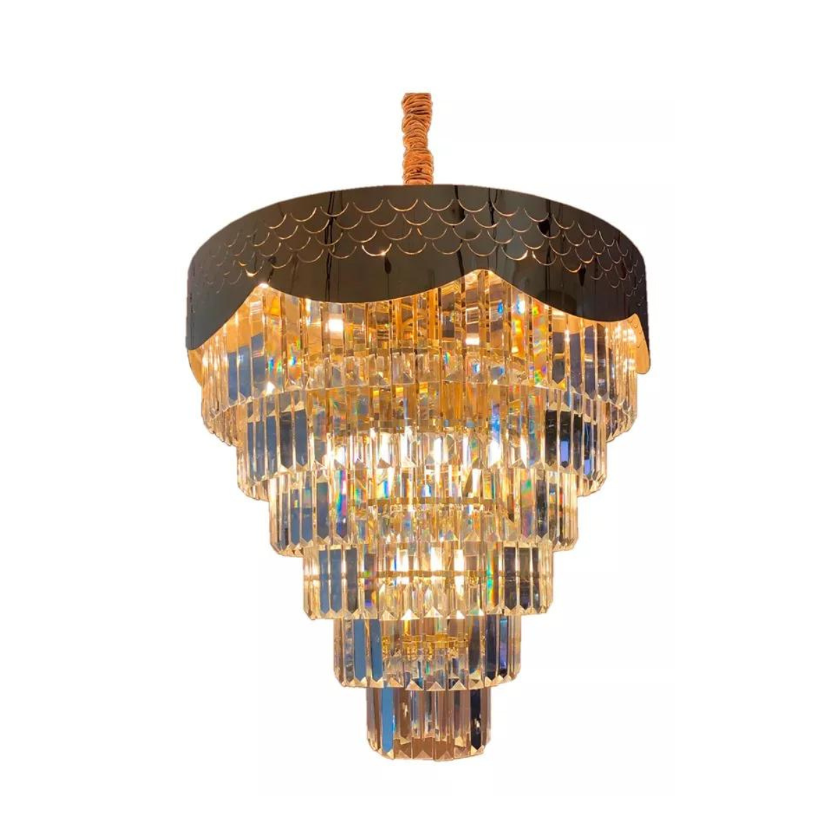 Admire a harmonia perfeita entre o ouro champagne e os cristais que capturam e dispersam a luz de maneira sublime, criando padrões de brilho que encantam os olhos e elevam o ambiente. Com uma presença majestosa, este lustre não apenas ilumina, mas transforma espaços com seu charme inigualável.